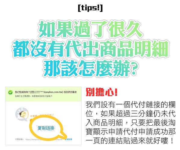 下標後請先確認賣家是否有優惠,若有優惠請先請賣家改金額後,在申請代付連結,若申請後才改金額,將導致代付連結失效無法付款。
