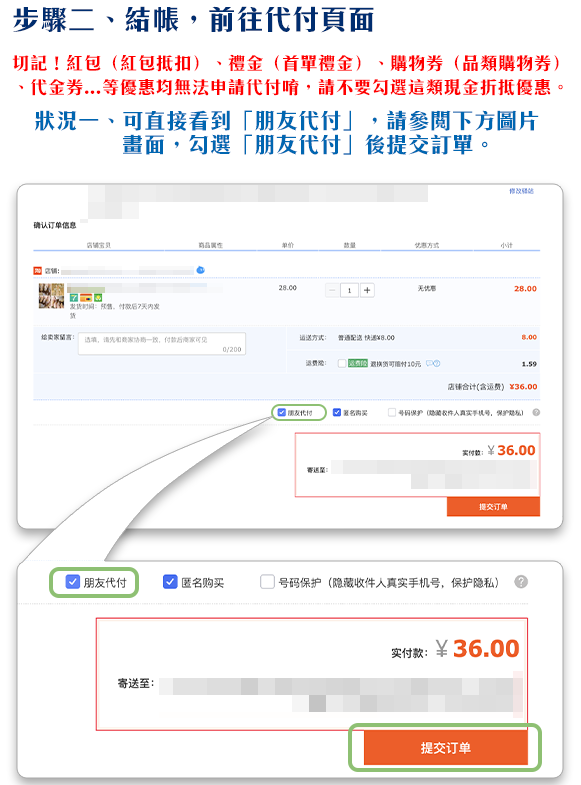 - 合併付款:阿里巴巴只支援單筆訂單申請代付喔!