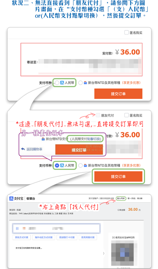 賣家改價:當您的訂單發生賣家改價的情況,只能在網頁點付款,支付寶付款頁面開啟後,選擇「支付寶擔保交易」,便可於右上角看到「找人代付」選項。