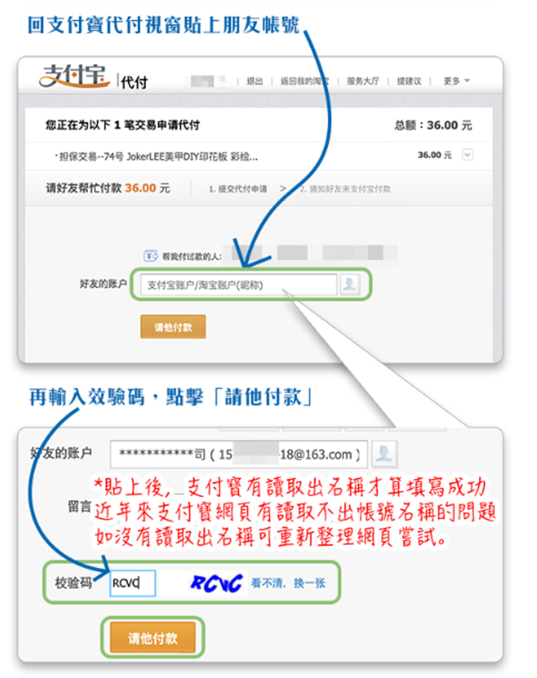 當時您在申請代付時,若於淘寶輸入的帳號跟GO購寶給您的好友帳號不同。人員則無法代付,請連繫客服幫您處理。 -