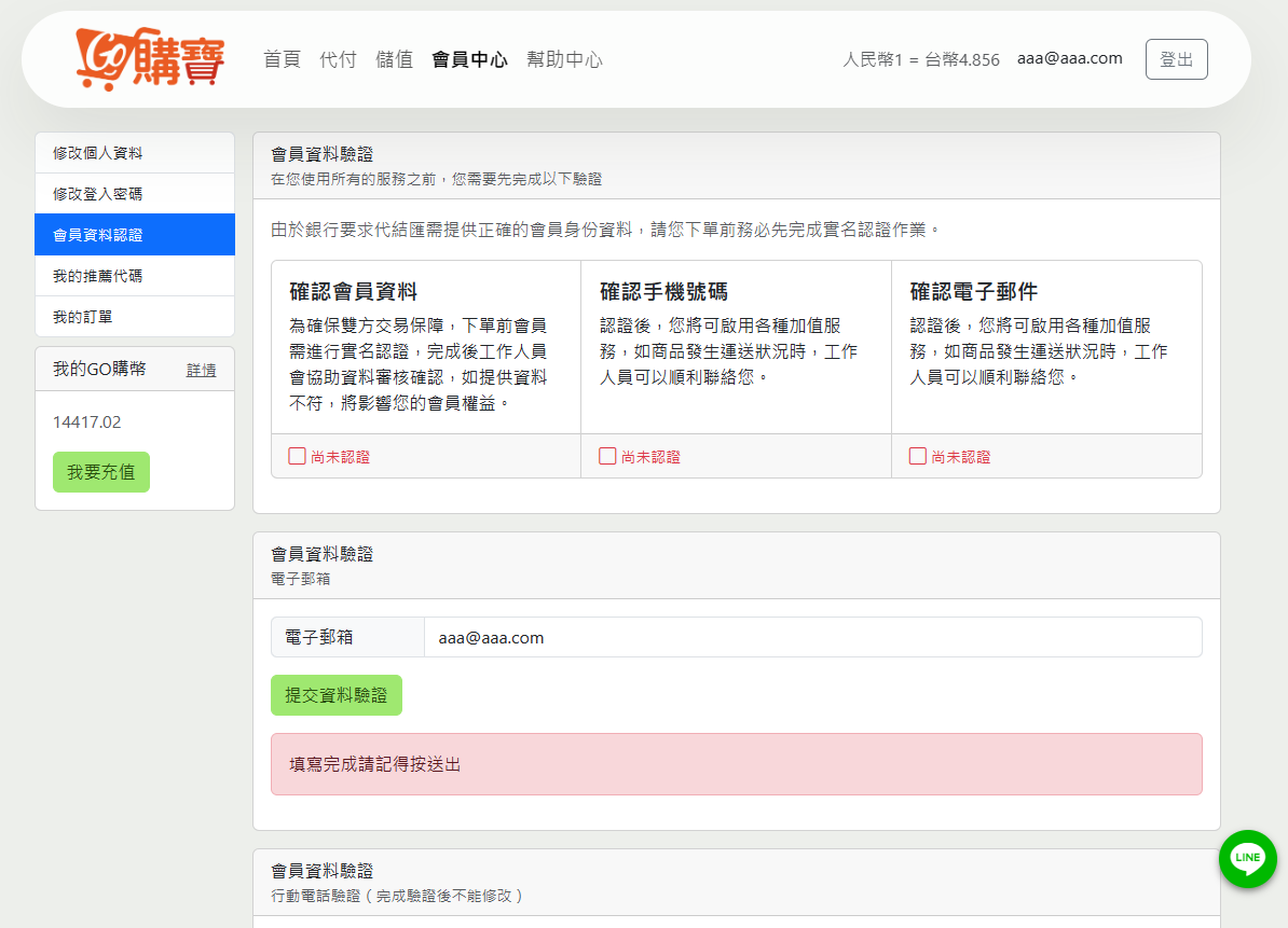 請您檢附以下資料,並說明欲修改資訊正確內容,並利用GO購寶LINE的方式進行聯繫,請您再次確認是否所有資訊都正確,更改姓名請附上身分證正面照片,手機號碼請附上三個月內電信門號繳費證明,客服中心收到後會於1-3個工作日內重新審核並回覆您處理結果。
