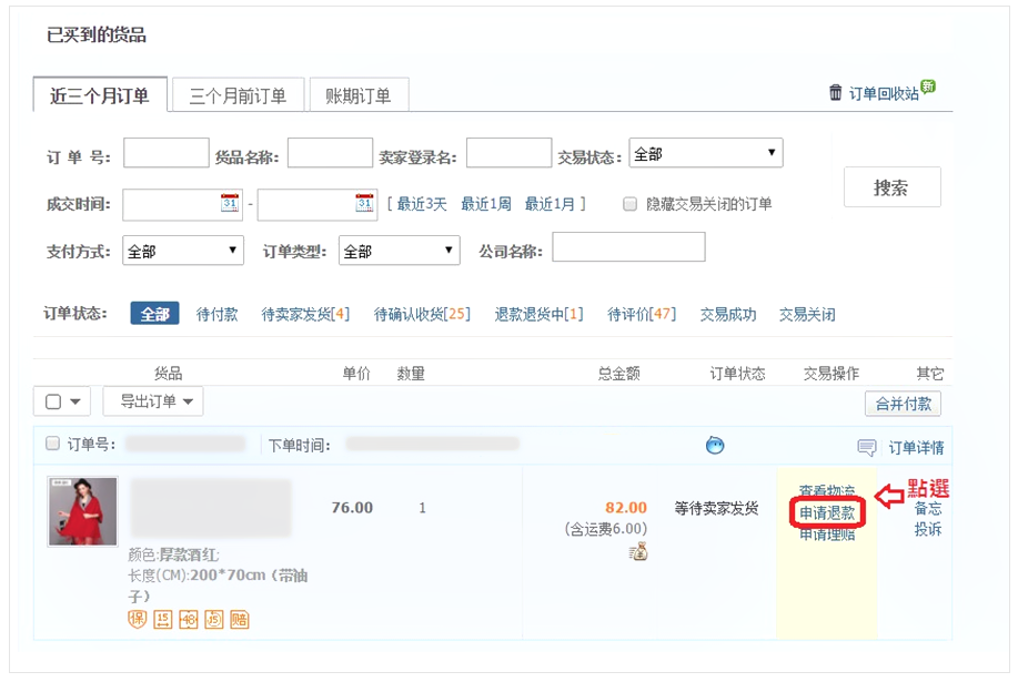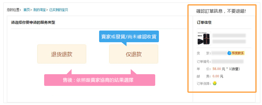 請至 我的淘寶> 已買到的寶貝> 找到欲退款商品> 退款/退貨