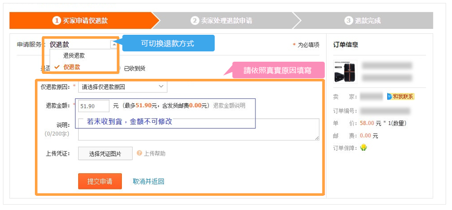 使用官方退款方式,請至淘寶網-已買到的寶貝,找到該筆商品,點選退款/退貨。 -
