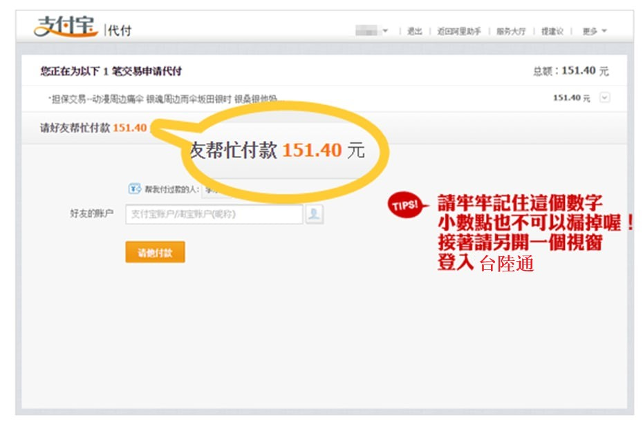 您必須先於淘寶或1688開通您的會員帳號〈任一網站註冊完畢,支付寶帳號即會同步開通〉,開通後,您可於淘寶、1688下單,並透過支付寶提出代付申請,請留意支付寶官方限制一個帳號一天只能申請10次代付(包含取消)、合併代付不得超過2萬人民幣,相關規定以支付寶官方說明為準,可能隨時變動,若有疑慮請您聯繫支付寶客服。 -