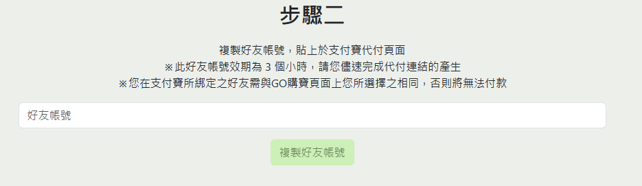 若有多筆訂單,請將所有金額相加輸入至STEP1,等STEP2顯示好友帳號,將所有訂單全都填一樣的好友帳號,若無按此方式操作,可能會造成無法及時付款的情況。